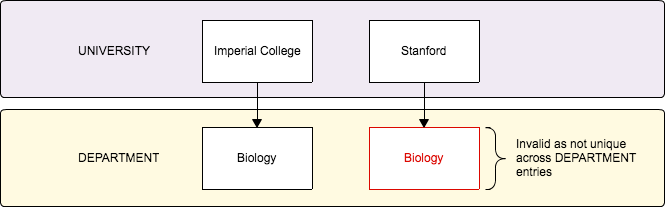 The solution is to set the uniqueness as hierarchy, to have the parent entry considered. This way the "Biology" DEPARTMENT can be entered only once but for each UNIVERSITY entry.