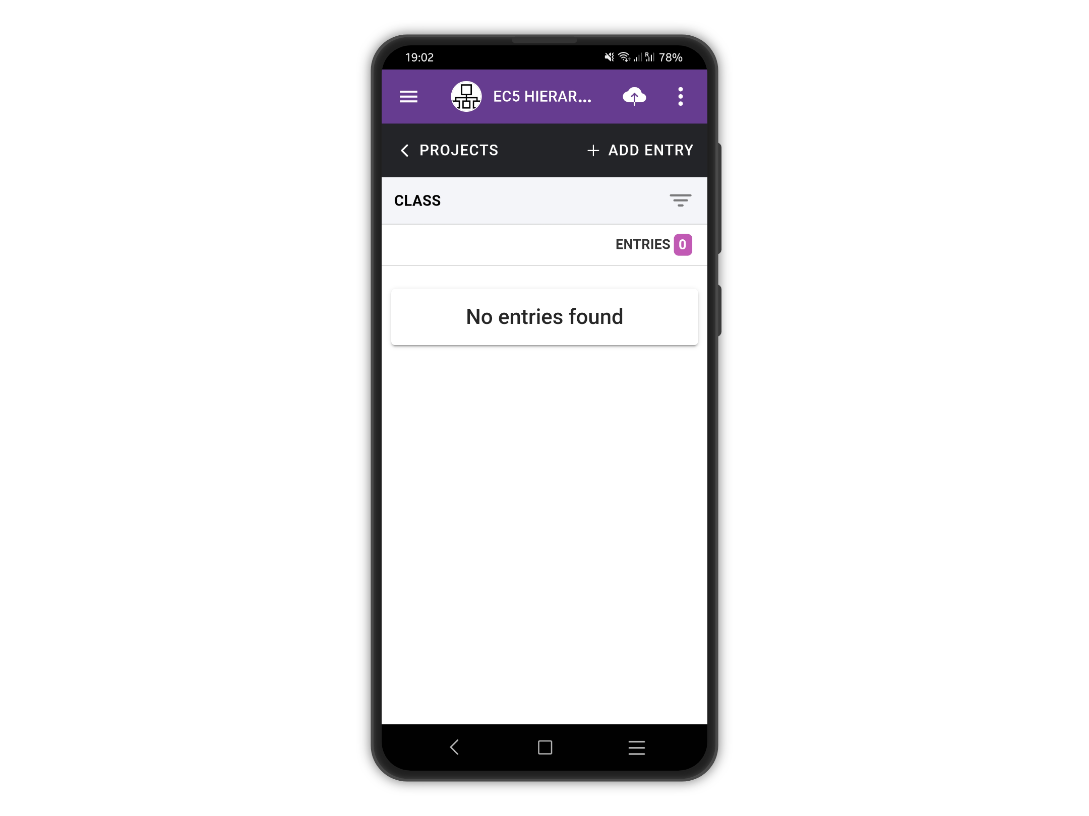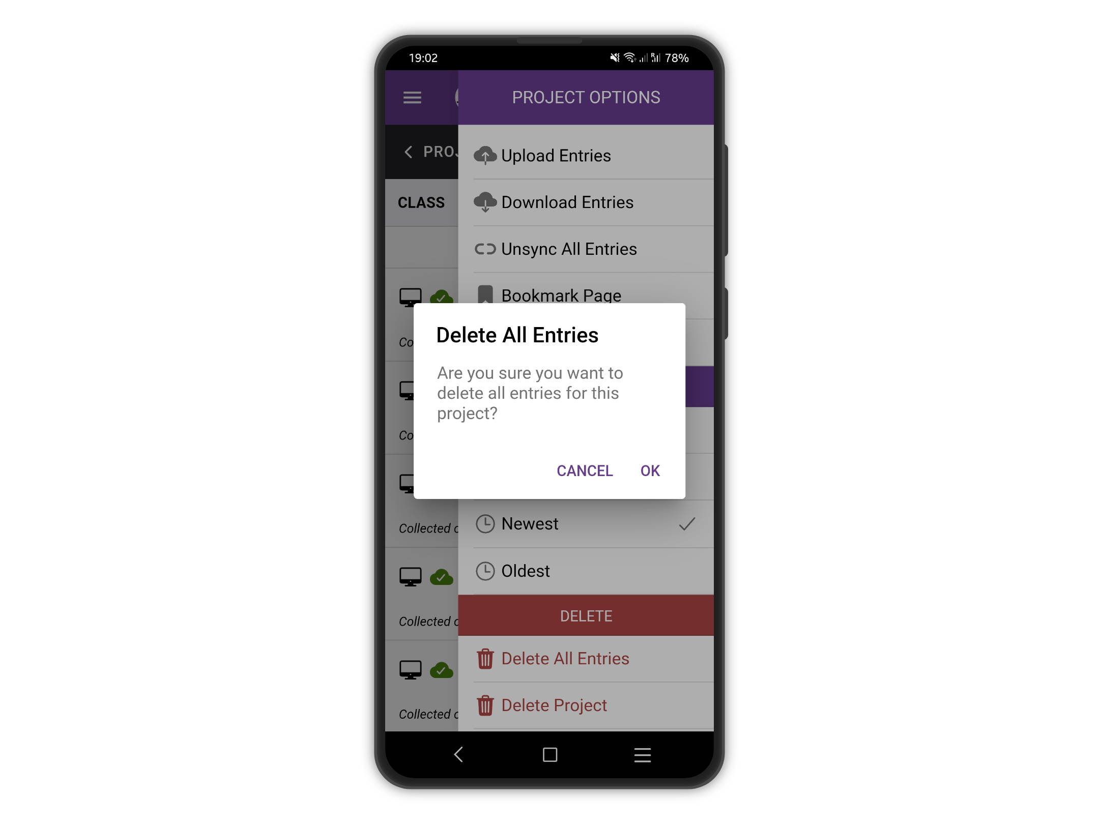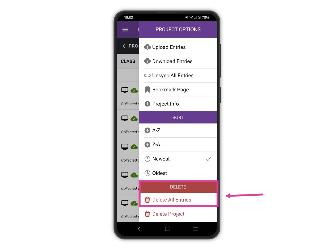 Open the right drawer menu by tapping on the "Menu" button, the three vertical dots at the top right. From the list of options tap on "Delete entries" to delete all the entries for a project.
