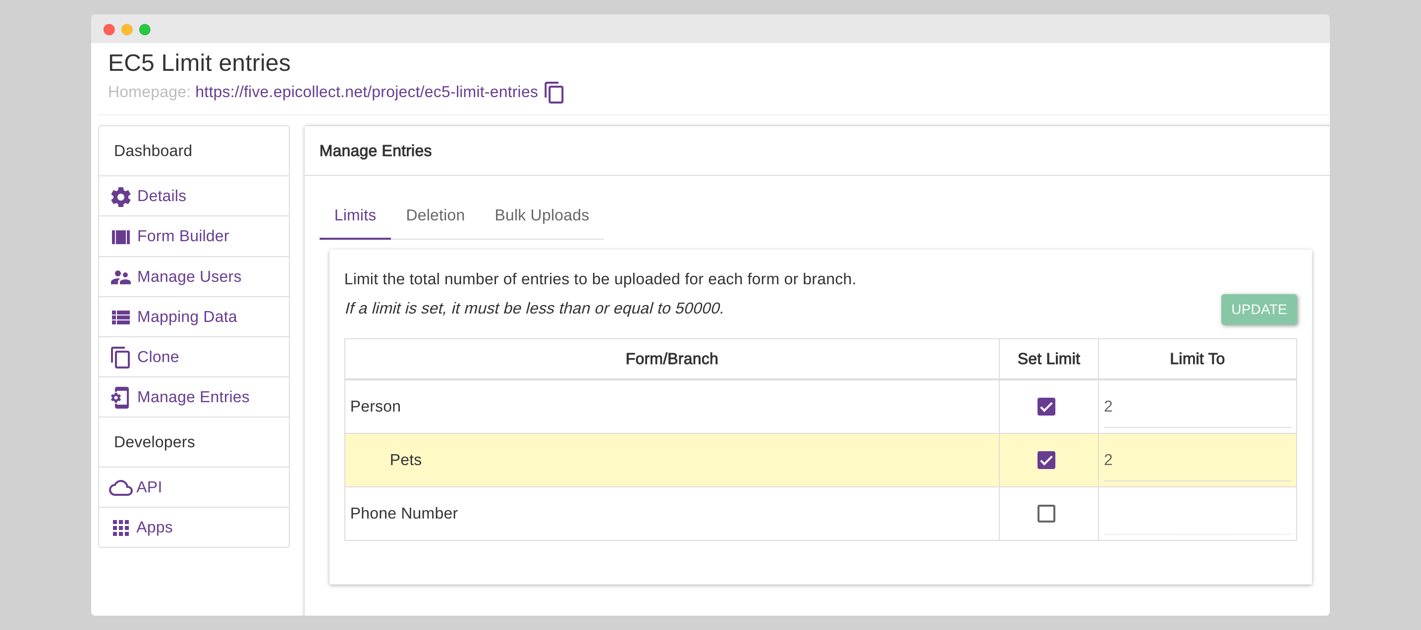 For example, let's have a look at our example project [EC5 Limit entries.](https://five.epicollect.net/project/ec5-limit-entries)