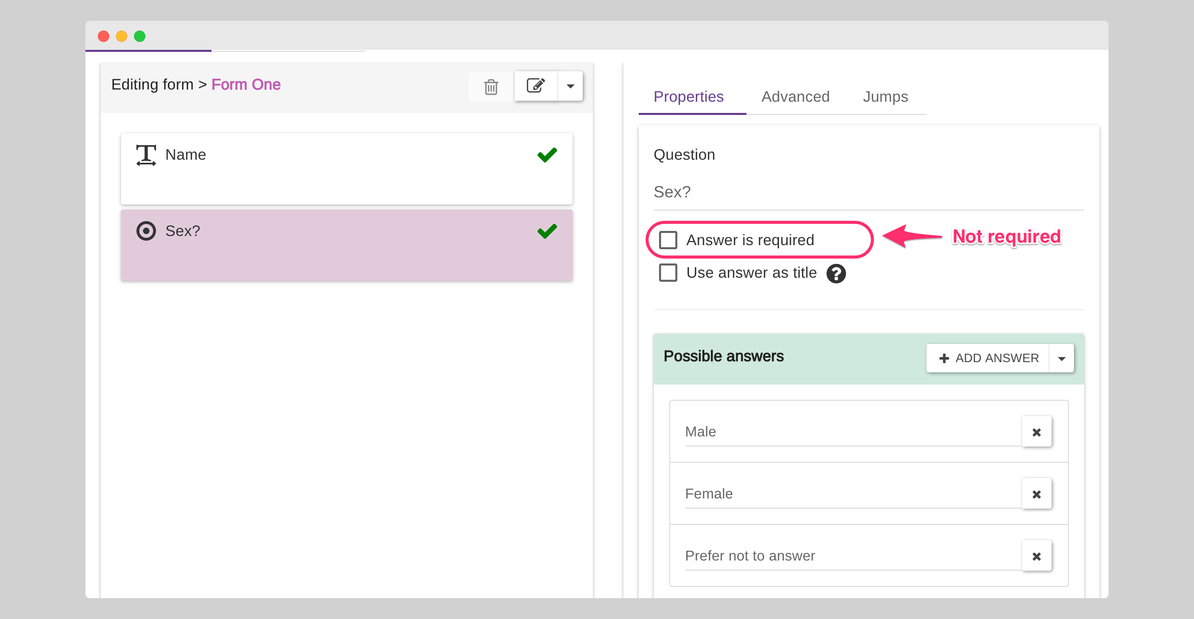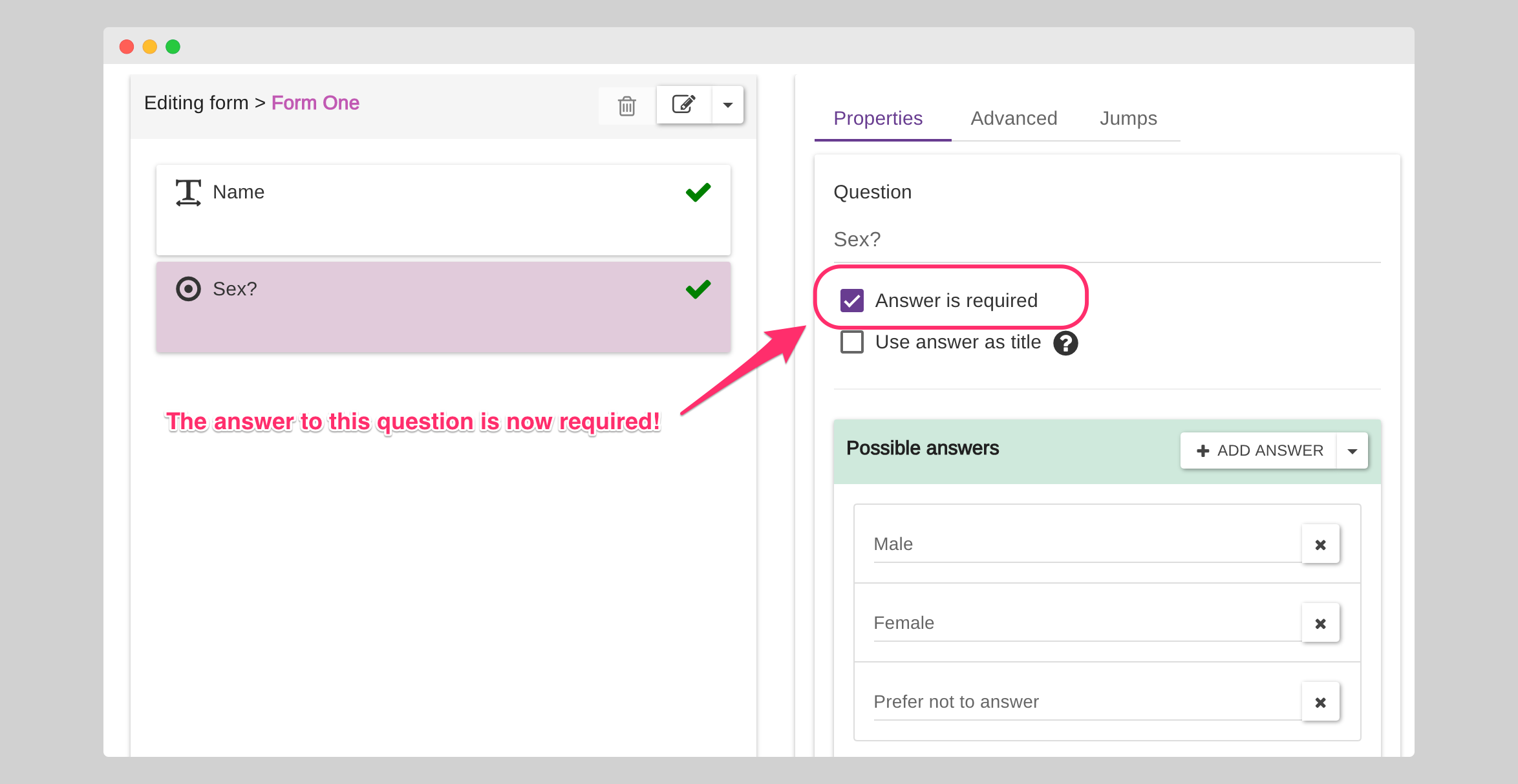 Before uploading, we make a change to our form and set the "Sex?" question as required: