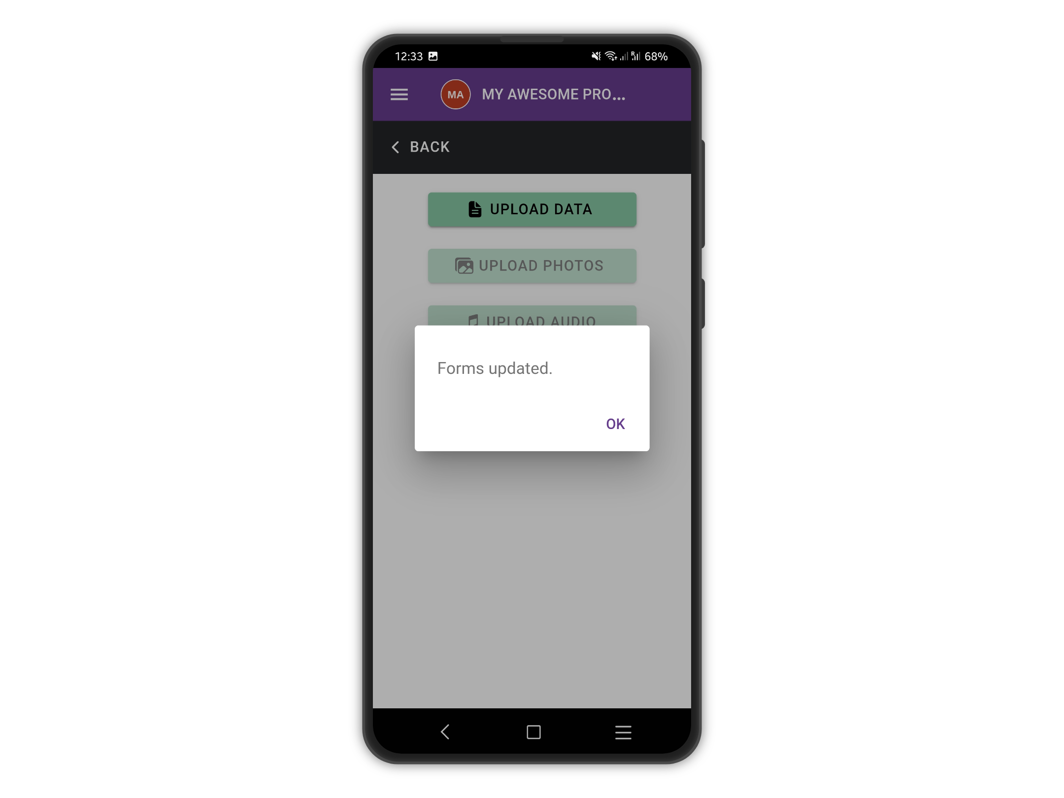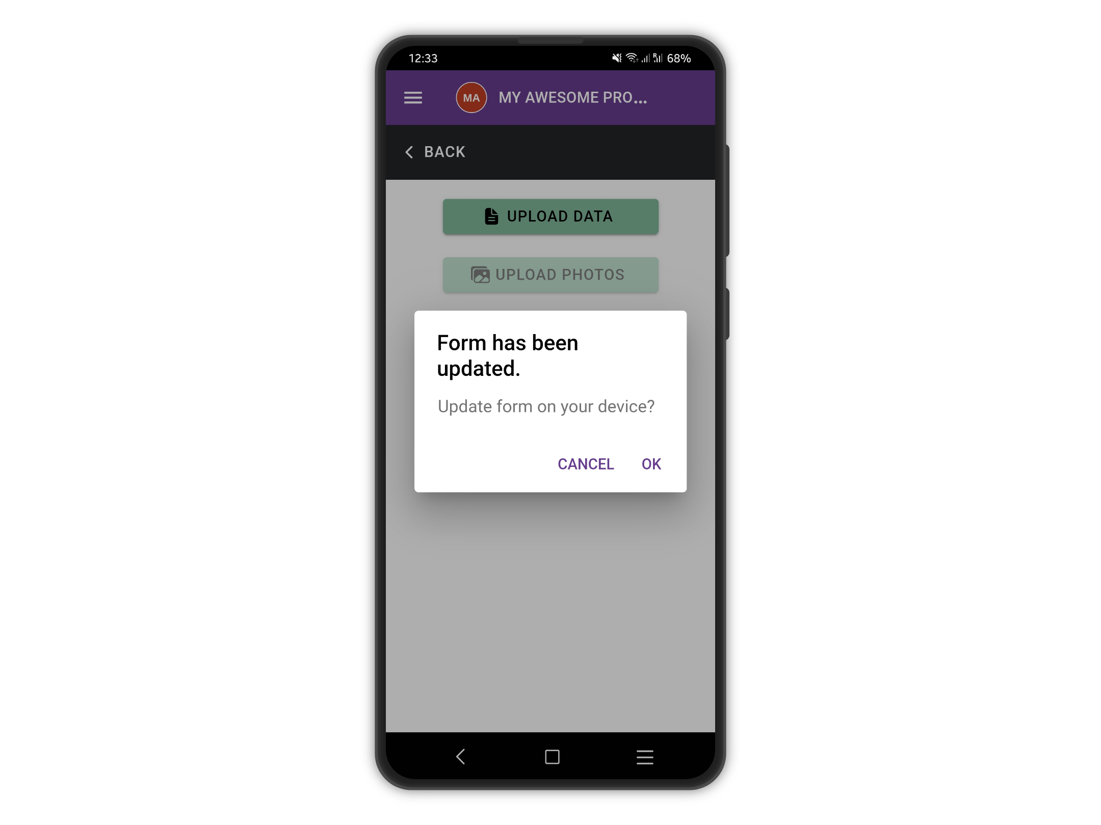 If we try to upload, a message is shown asking us to update our form. Let's tap **OK**.