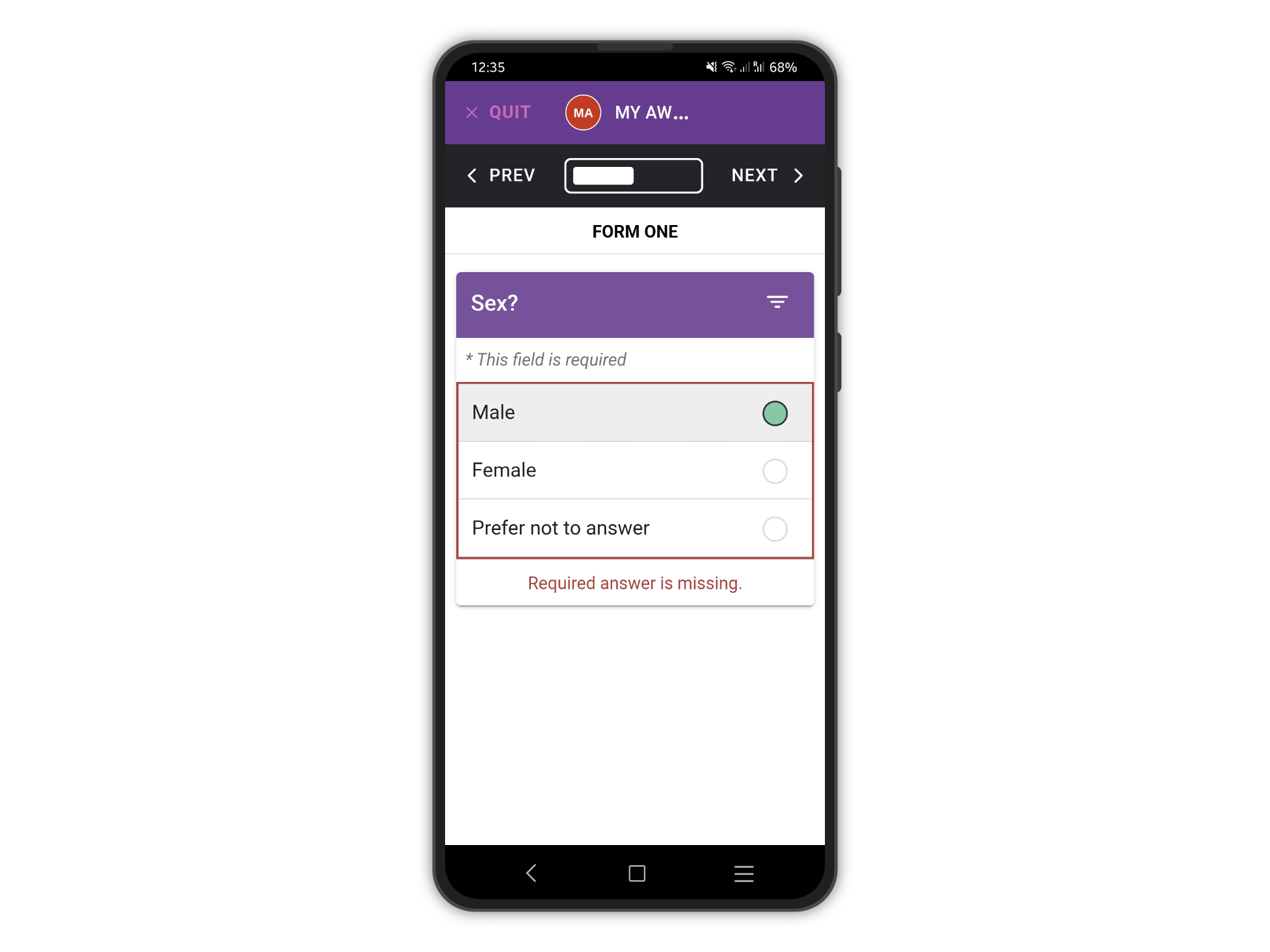 If we try to upload after updating the form, we will get an error as some existing entries on the device do not meet the requirements anymore. In our case, the "Sex?" question is now required therefore it must be filled in.