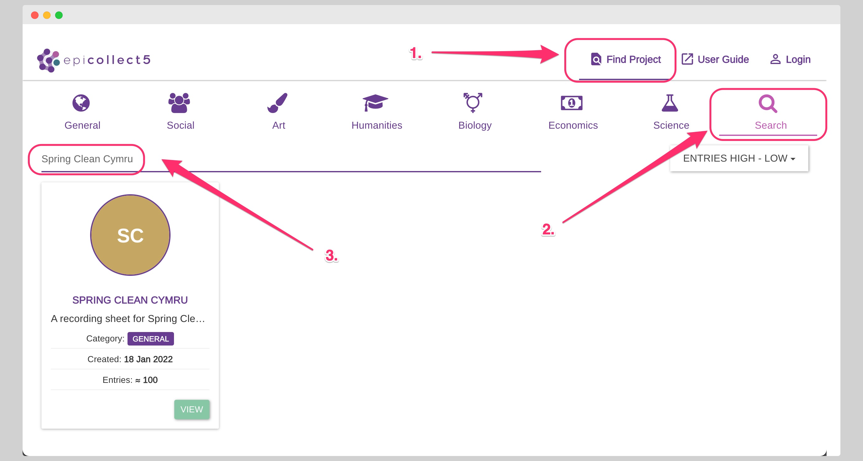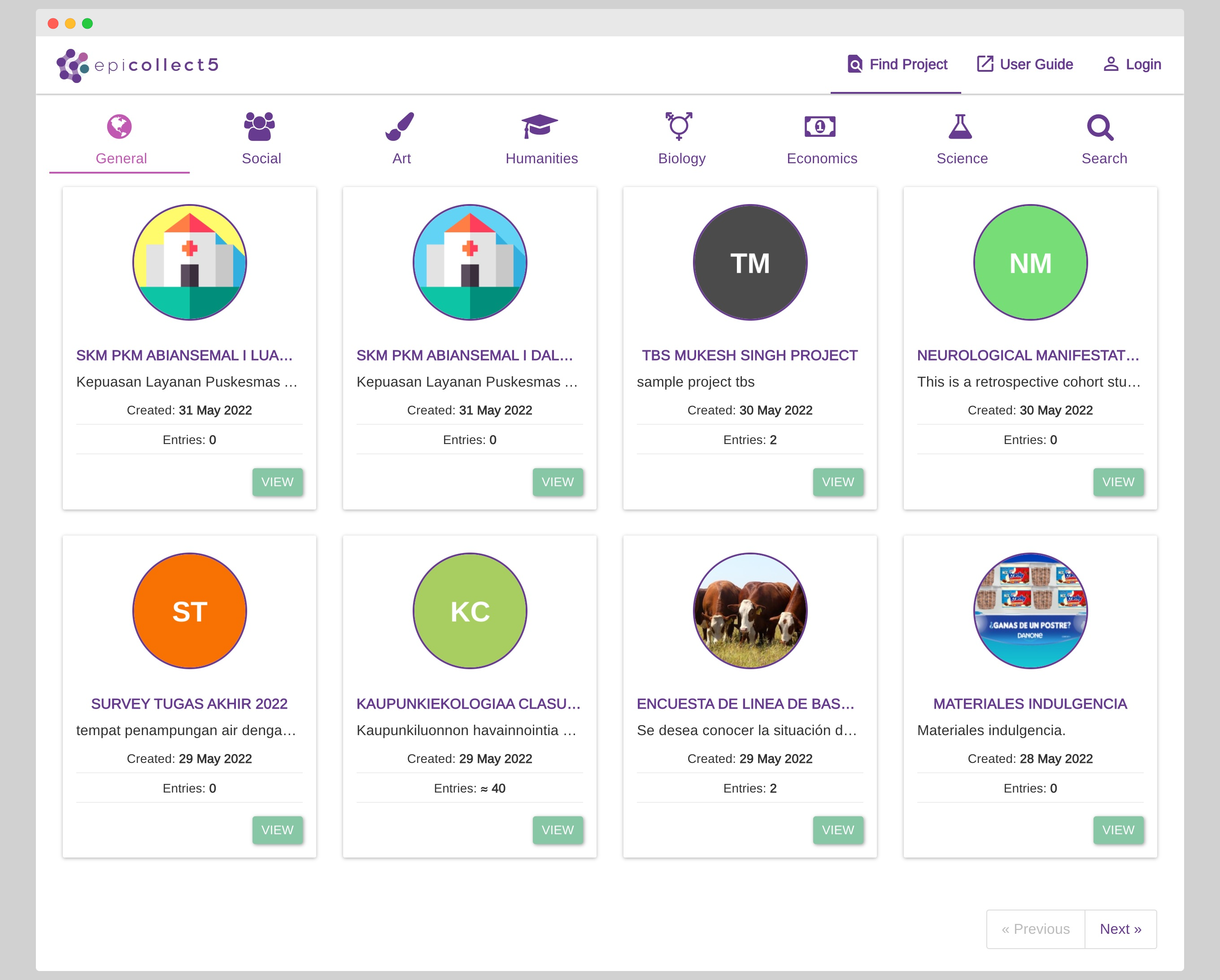 **PUBLIC** and **LISTED** projects are shown on the Epicollect5 projects page at [**https://five.epicollect.net/projects**](https://five.epicollect.net/projects) (Click on any "Find Project" button)**.**