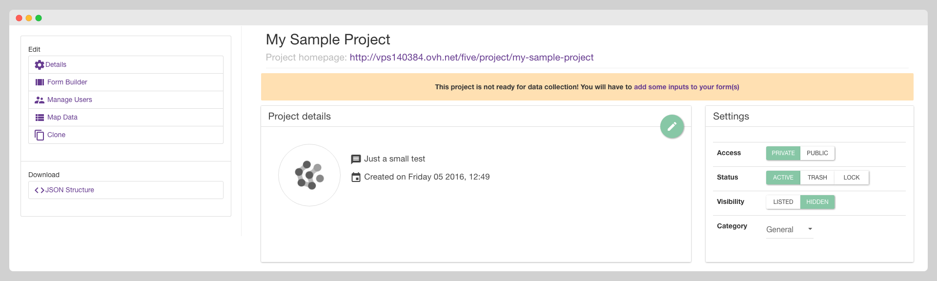 * **ACTIVE**: The project can be viewed, and data can be collected and uploaded.