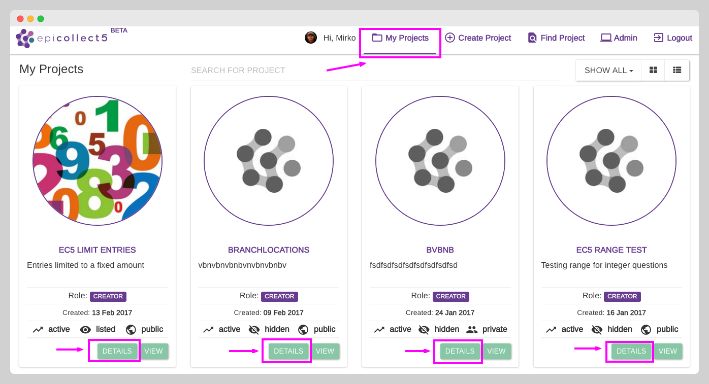 To access the project details page, click on "**My Projects**" and then the "**Details**" button for the project you wish to edit.